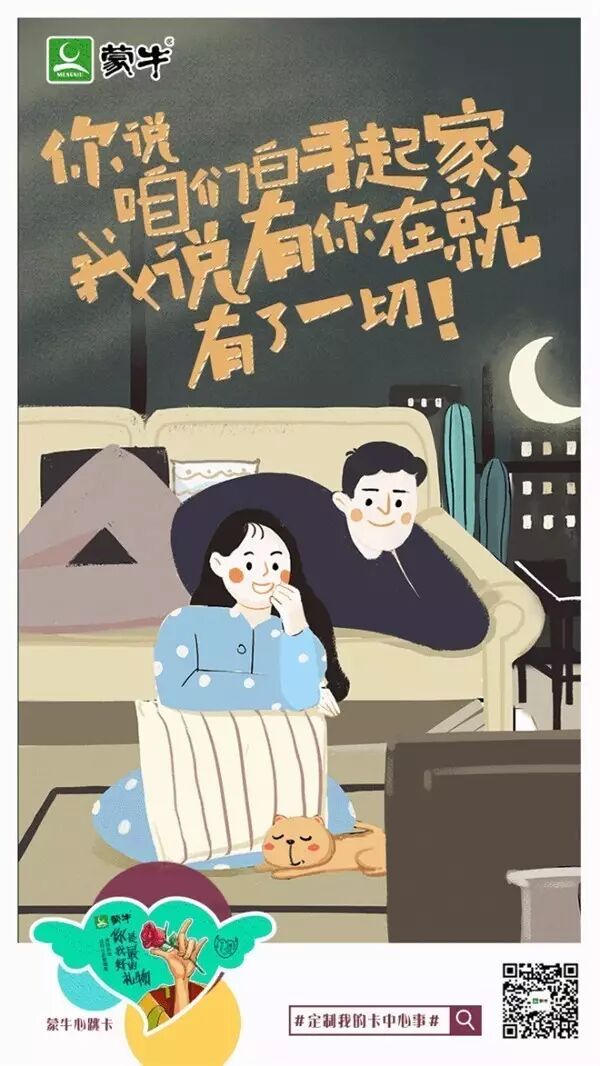 今天上午,蒙牛推出的一组七夕海报,文案中回答了一些现实的问题,例如“你说,咱们白手起家!我说,有你在就有了一切”。