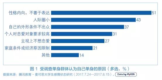 同时,数据显示,单身群体中认为个人目前单身的最主要因素是“性格内向,不善于表达”,27%的学生称享受单身生活,“主观上不想谈恋爱”。