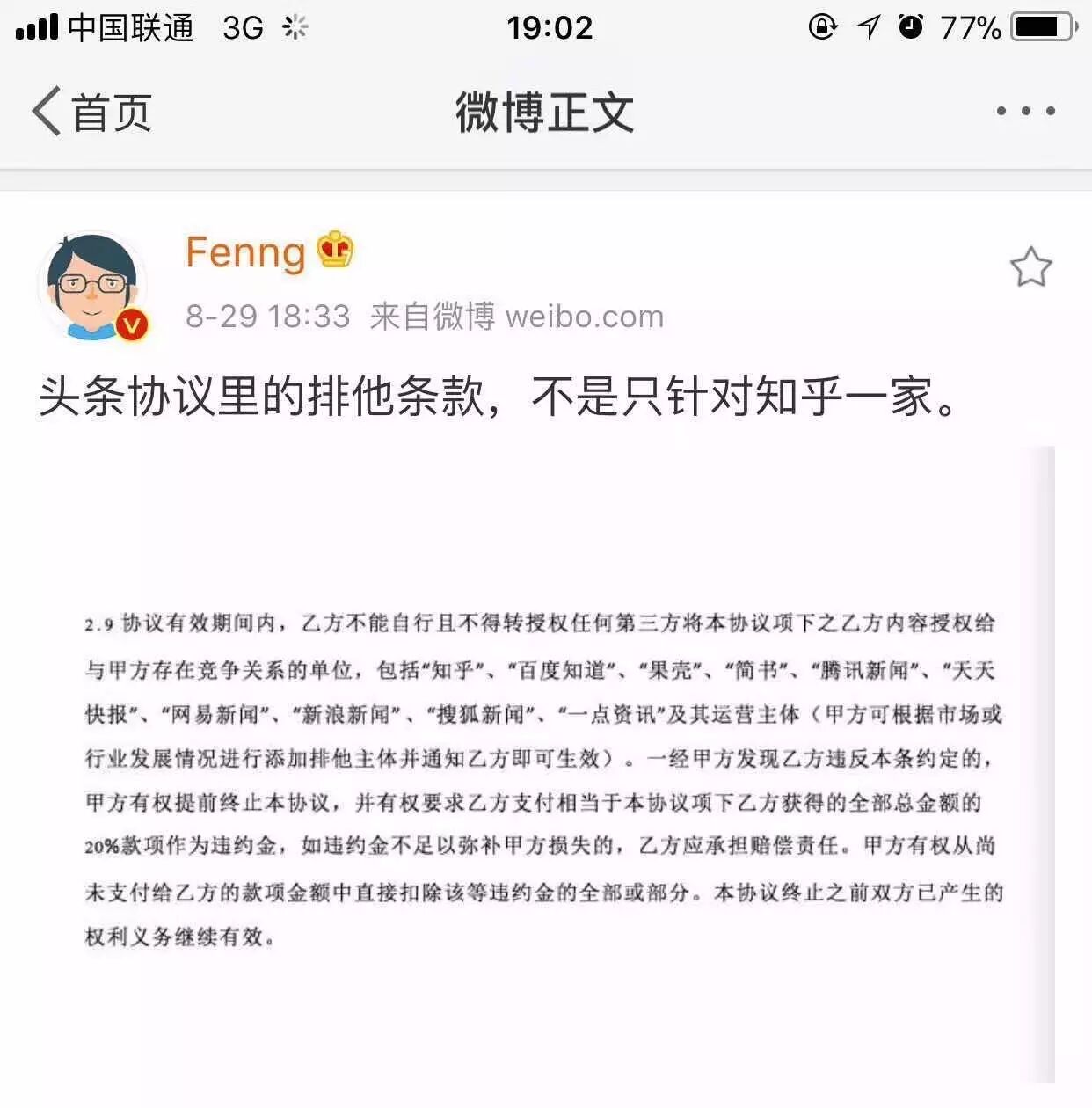 悟空问答的回复不见得大家都买账。“小道消息”出品人@Fenng 发微博称,“头条协议里的排他条款,不是只针对知乎一家”,并配上一张疑似协议内容的图片。
