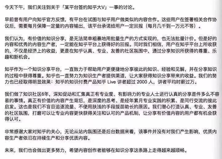 眼见事件讨论渐入白热化,今天傍晚,知乎通过新浪科技对此事做出回应,称“有价值的知识分享,是无法简单粗暴地用批量生产的方式实现的,也无法批量计算”,并表示该事件并没有对知乎产生影响。