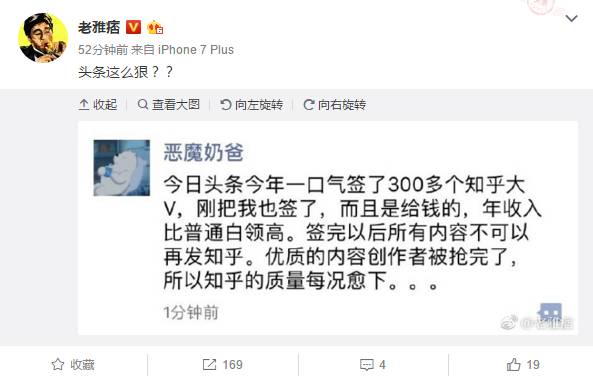 今天下午,微博上传出一张知乎大V“恶魔奶爸”的朋友圈截图,图中称,今日头条今年一口气签了300多个知乎大V并提供比普通白领更高的年收入,但签完后所有内容不可再发知乎。