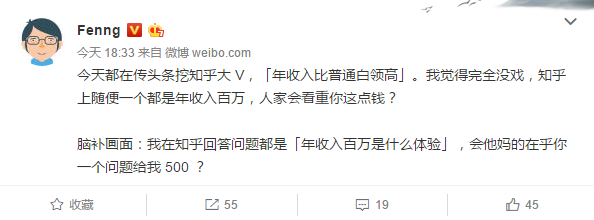 此外,@Fenng 还认为今日头条挖知乎大V没戏:“知乎上随便一个都是年收入百万,人家会看重你这点钱?”