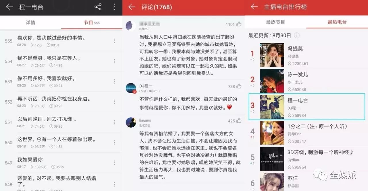 另一位网络电台主播程一,也是低音控们的心头好。程一电台在主播电台综合排行榜中高居前三,被众多迷妹誉为“耳朵里的男朋友”,他的评论区也同样扎心。