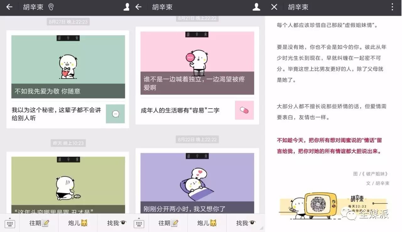 除了伴着声音入眠之外,夜间情感读物也是一大热门。公众号“胡辛束”的定位相当明确,以“每晚22点准时重启你的少女心”为口号,打造文字版的女性夜间情绪出口。