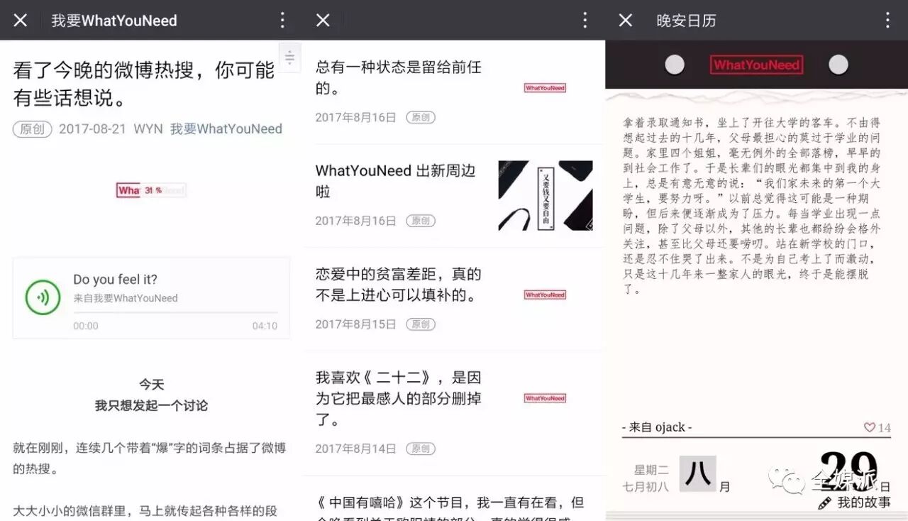 而“我要WhatYouNeed”将自己标榜为“年轻人的聚集地”,探讨的话题更为广泛,不仅有爱情、友情、工作、生活,还会跟进热点事件。如创始人陈裕明所言,WhatYouNeed的题眼在于“Need”——有别于架空式的情感抒发,它加入了贴近热点的话题探讨,以填充年轻人的话题需求。