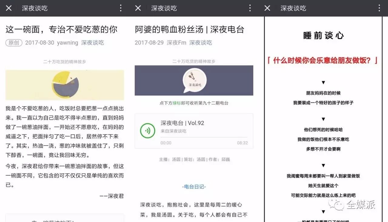 对于吃货而言,深夜胃袋勾起红油火锅、小龙虾、葱油拌面的念想,是最百爪挠心的时刻。自称是“二十万吃货的精神故乡”,公众号“深夜谈吃”在每晚十点推送日常美食故事,并和读者一起“睡前谈心”,聊“吃”的话题——大概每读完一日份的推送,就得翻箱倒柜,填一填空虚的胃才行。每周,深夜谈吃还会推送一期深夜电台,用声音唤起你的食物记忆。