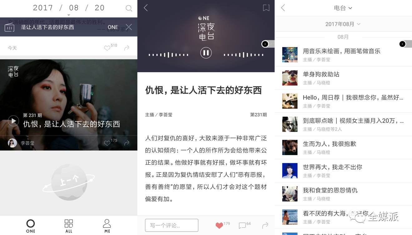 这个电台藏在ONE应用的最底端,只在深夜提供服务。在其他时间段,它会出现“晚上10:30开播”的字样,并提示你左滑收听往期节目。