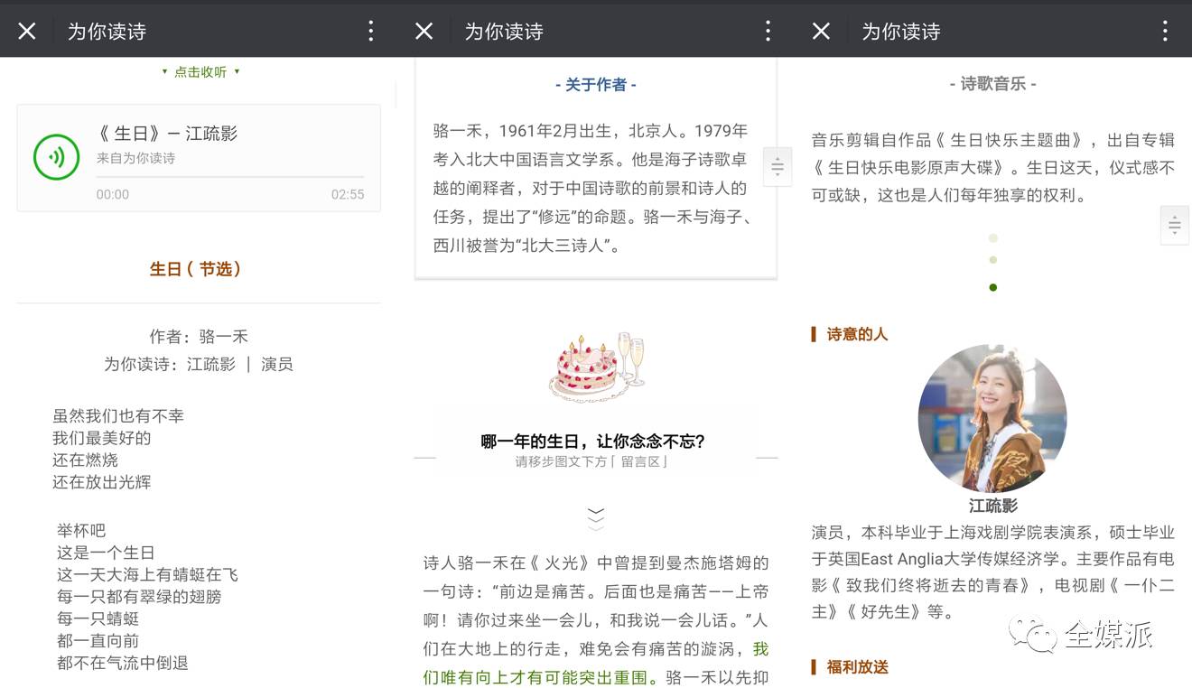 一篇推送包含了名人朗读、诗人介绍、诗篇解读等内容,读来无形中感染了几分诗性的意趣,却又毫无功利性的负担,也难怪能收割篇篇10w+的好成绩。作为睡前读物,它确实是相当精致的养料了。