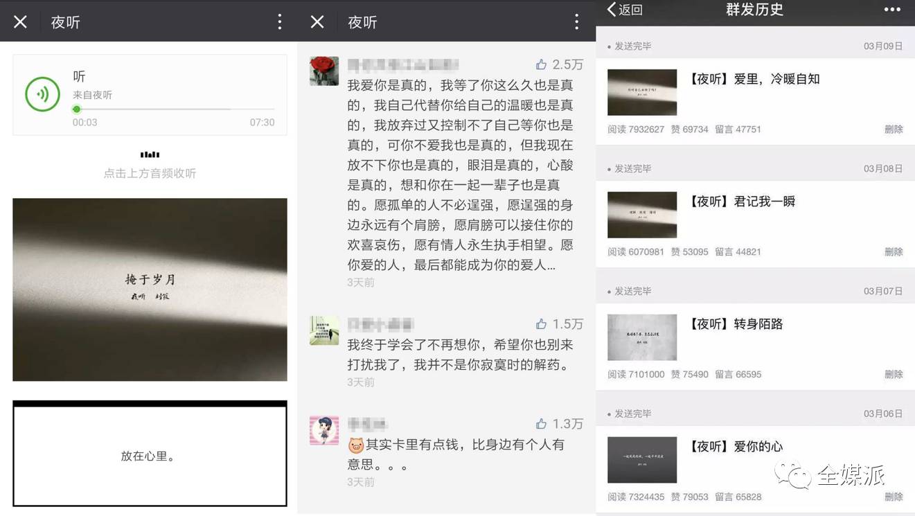 公众号“夜听”就是一个坐拥千万粉丝的情感大V。几分钟的音频,配上两句的图文鸡汤,构成了一篇推送内容。根据公众号运营者兼主播刘筱透露的数据来看,就是这样简简单单的推送,每篇文章基本上都能收获六七百万的阅读量。