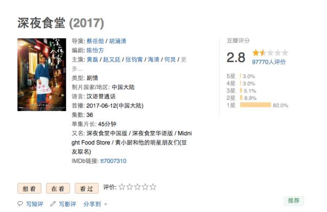看这豆瓣的评分,2.8分,也是有点尴尬了!要知道日版《深夜食堂》第一季的豆瓣评分可是高达9.2分。