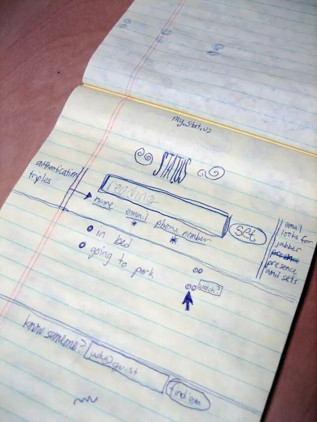 这是Jack Dorsey在2000年前后画在笔记本上的内容,他希望能够结合互联网和短信功能向用户提供分享即时状态的服务,这也是140个字符上限的由来(移动运营商对于短信字符的限制是140个)。