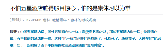 对此,知名评论人曹林在《不怕五星酒店脏得触目惊心,怕的是集体习以为常》一文中指出,事件曝光后,媒体懒得追踪,监管懒得介入,企业懒得回应,公众懒得较劲。这种漠然的态度让人震惊。