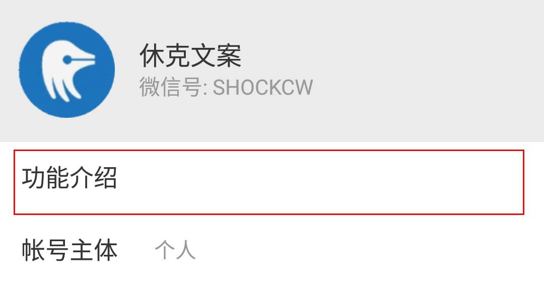 简单点理解,就是这个公众号在读者这里是扮演什么角色。比如保姆,专家,还是少女杀手。比如,你身边的理财管家。比如,优秀创意的搬运工。以“休克文案”为例,功能介绍可能就会这样写。