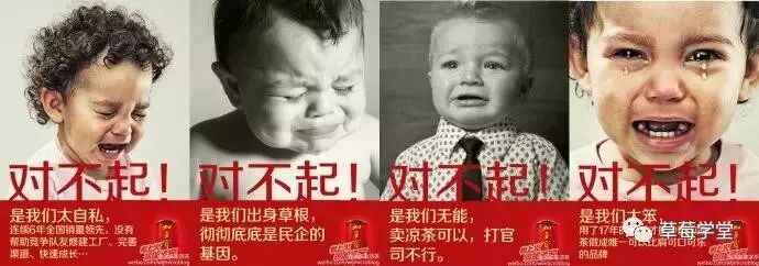 加多宝在与王老吉的官司败诉后,选取了四个哭泣的宝宝,并配以一句话文案诉说自己的弱势,表面悲情,实则却如利剑一般,刺中竞争对手的痛处,激起了大众的同情、愤怒,从而得到了有效传播。