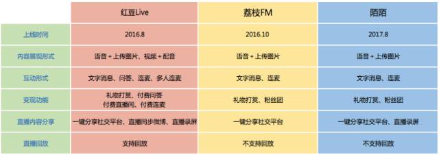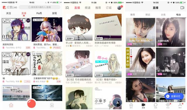 而在产品设置上,无论是直播内容展现、互动及分享,三者也都做出了很多尝试。展现多为语音+上传图片,互动上支持连麦和文字,分享上具有回放与分享到社交平台等功能。红豆Live作为独立的语音直播app相对产品体系更完整,但三者通过产品,在玩的依然是主播与受众之间双方的一个互动与情感联系。