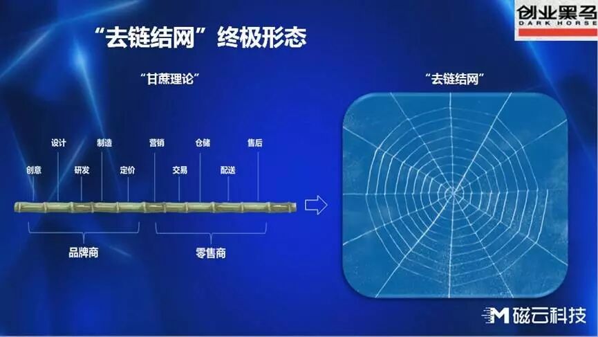 但是链式思维有一个弊端,因为它是串联结构,所以一旦中间有一个节点出现问题,后面的环节都要受到制约。互联网最早的一个词叫web,产业互联网最终应该变成蜘蛛网的样子,大家都要链接起来,任何两个节点之间都有多条路径可以到达,这样才能自我优化。