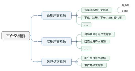 例如,产品的总体KPI是交易额(流水),那么从交易额拆分下来,包含了用户的拆解和品类的拆解,这两个方向还可以继续往下拆解,例如用户可以拆解为新用户和老用户,新用户还可以按渠道拆解,老用户可以按消费层级拆解,也可以按活跃周期拆解等等。