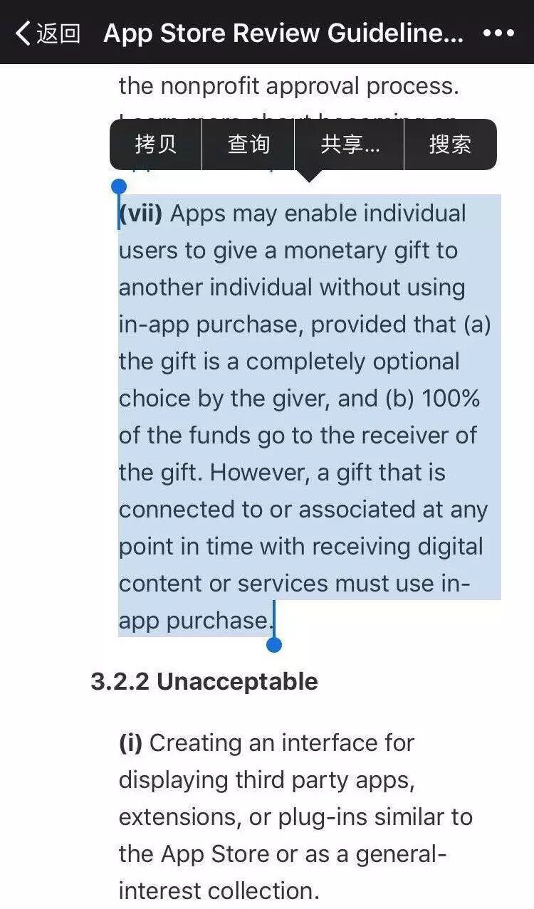 不过有熟悉苹果政策的人士认为,目前国内媒体对苹果新政可能存在误读,重点在“however”之后,如果苹果方面认定微信打赏、直播打赏属于“digital content”有关,恐怕依然要收取“苹果税”。
