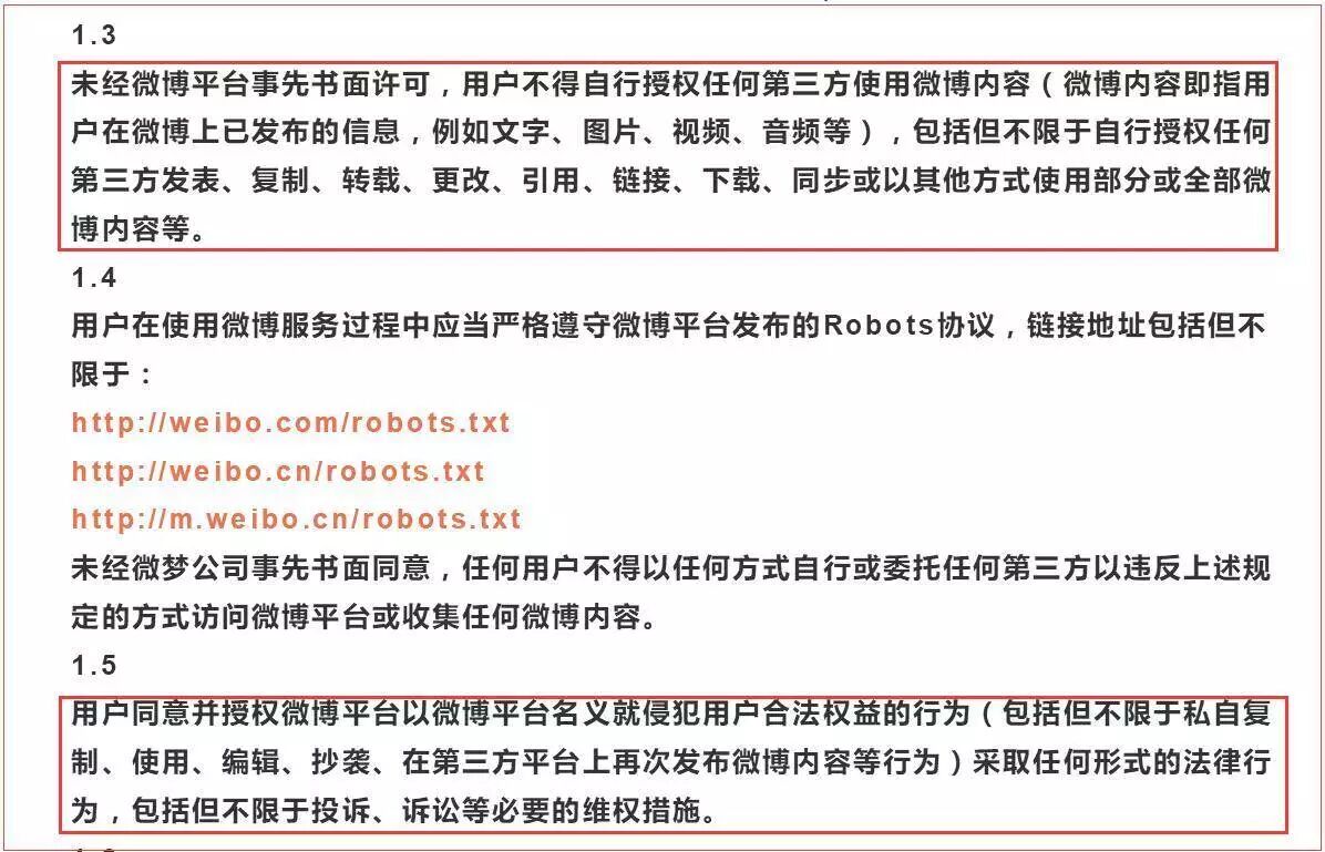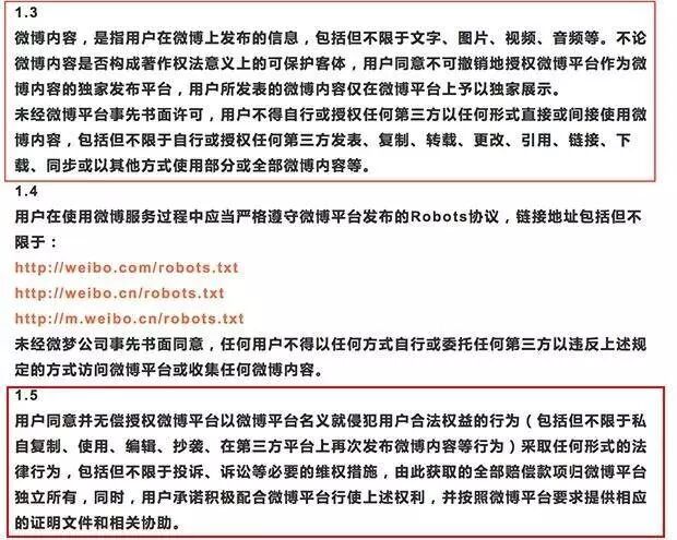 2、不论是谁想把你发布在微博上的内容转发到其他平台,都要经过微博书面许可,包括你自己;