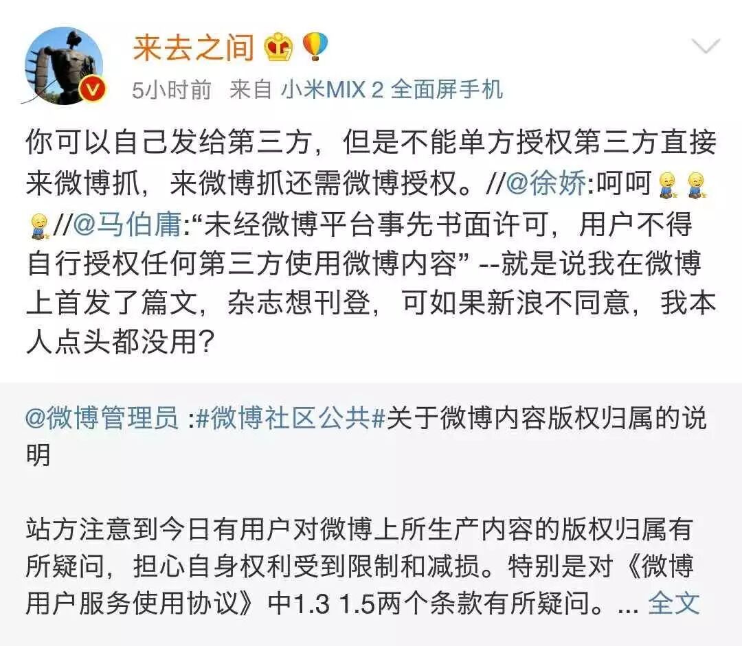 微博让用户二选一:要么将原创内容的版权归属于我,要么别使用微博产品。