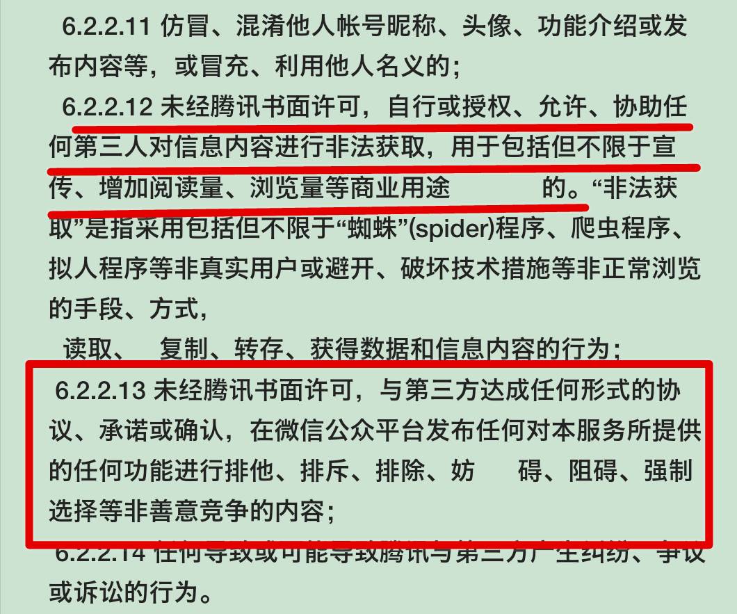 2013年,微信为了享用内容的独家版权,曾经也这么干过,当时的《腾讯服务协议》11.1条和《微信公众平台服务协议》9.1条曾规定:“腾讯在本服务中提供的内容(包括但不限于网页、文字、图片、音频、视频、图表等)的知识产权均归腾讯所有,但(腾讯)用户在使用本服务前对自己发布的内容已合法取得知识产权的除外。”