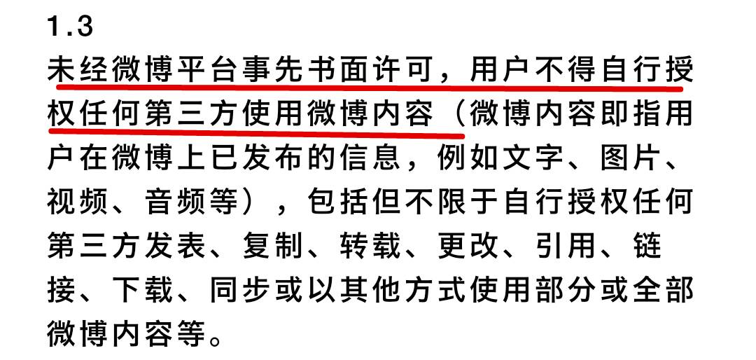 上周六凌晨,微博发布了一则关于微博内容版权归属的说明,单方面宣布:“未经微博平台事先书面许可,用户不得自行授权任何第三方使用微博内容”。
