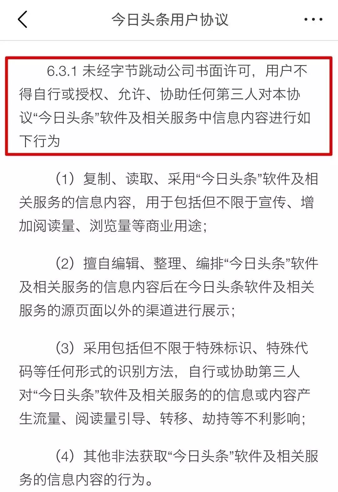 今日头条的用户协议中也写着,未经书面许可,不能自行或授权、允许、协助任何第三方进行包括复制、读取、编辑“今日头条”软件及相关服务的信息内容。