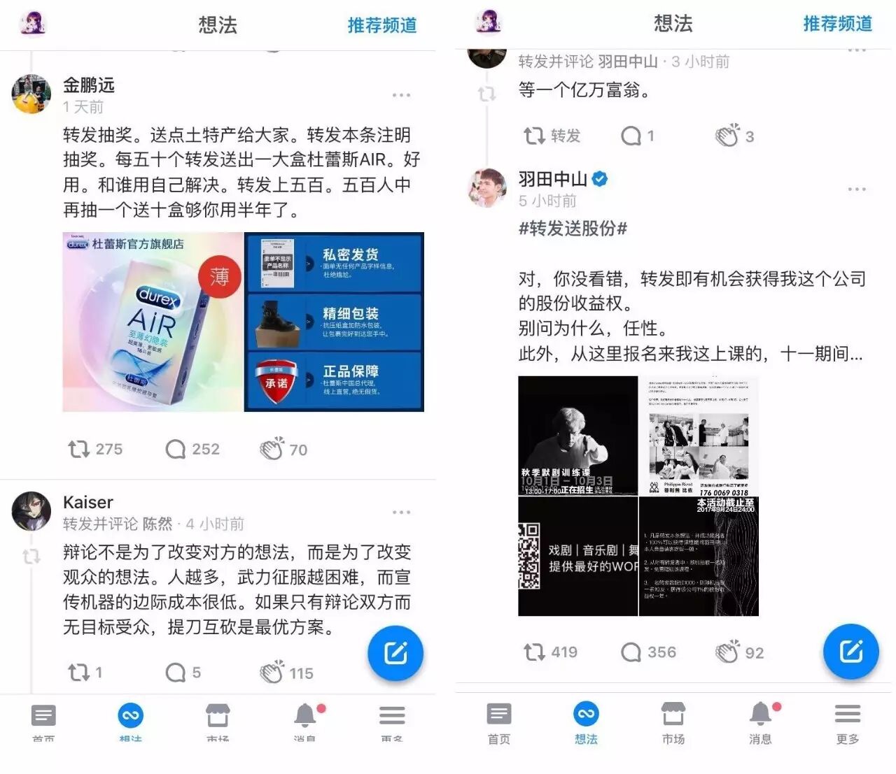 戏剧性的是,周源最近发了一条“想法”,并提出转发抽奖送新书。然后另一位知乎大V效仿也发了条转发抽奖送现金,可是被知乎删除并封号七天。双标待遇引来众人不满,于是这几天知乎变成了转发抽奖的海洋。