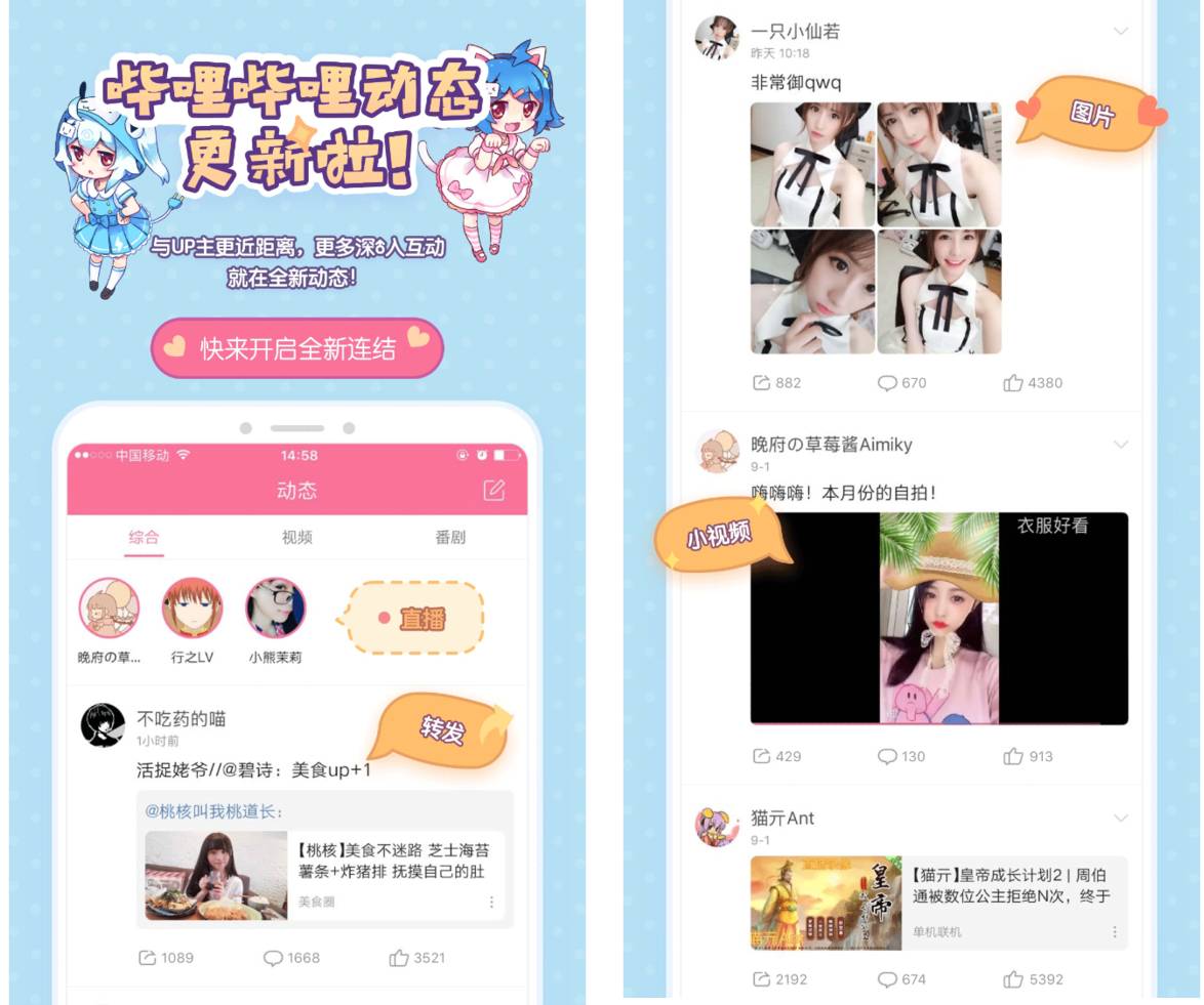 另一个新加入的玩家是B站,这几天B站正式推出了“动态”功能,UP主们不仅可以更新视频,还能发文字发图片,能转发评论点赞,总之也是把“微博”搬了进来。