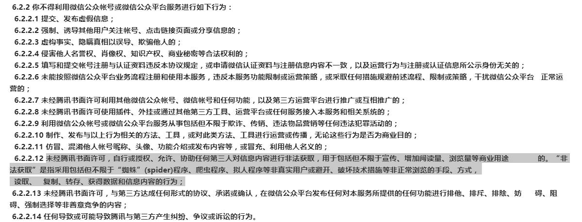 在《微信公众平台服务协议》的平台使用规范6.2.2.12中写道: