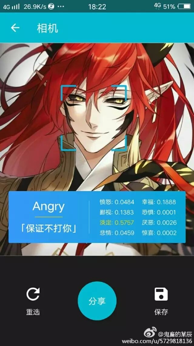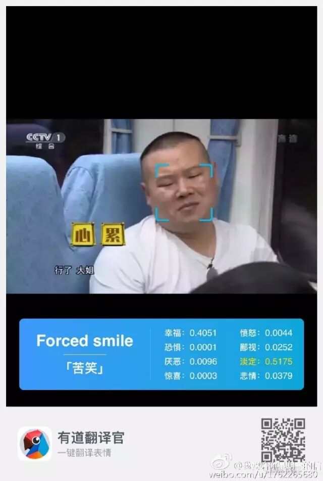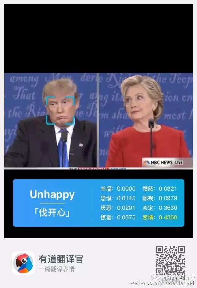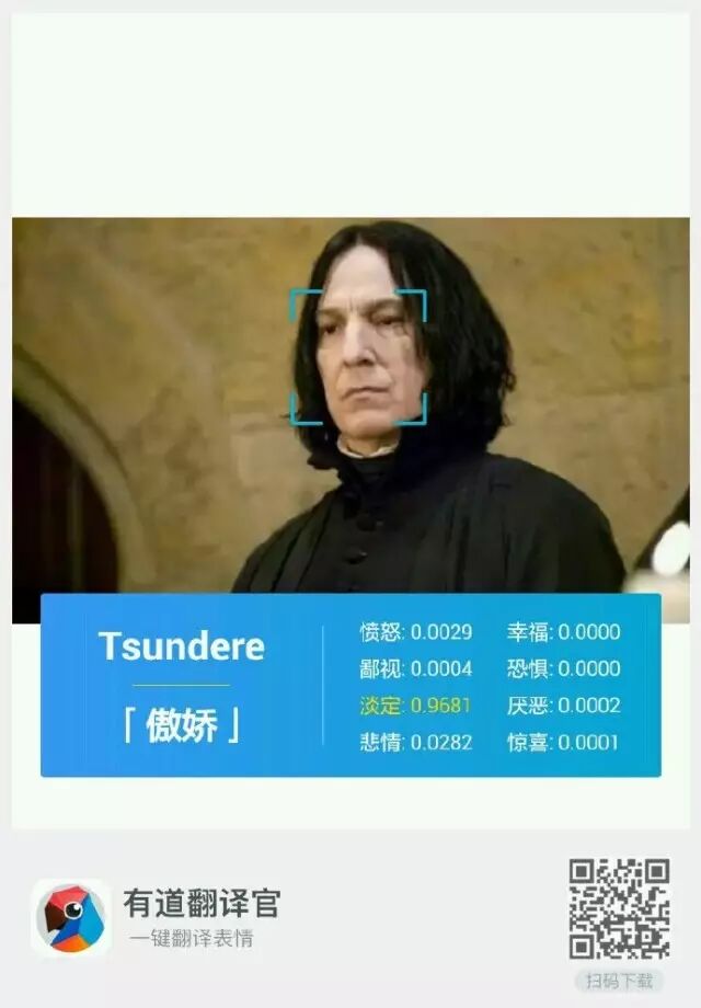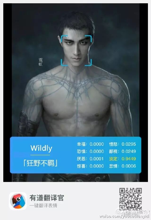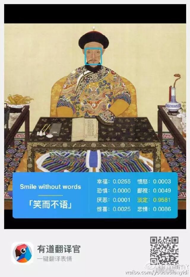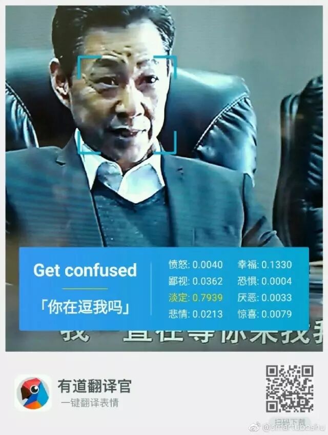 打开APP,进入“拍译”选择“表情翻译”,拍下当前的表情并进行解析,根据人类的情绪变化,有道翻译官设置了8个不同的评价标准,分别为幸福、愤怒、恐惧、鄙视、厌恶、放空、惊喜、悲情。