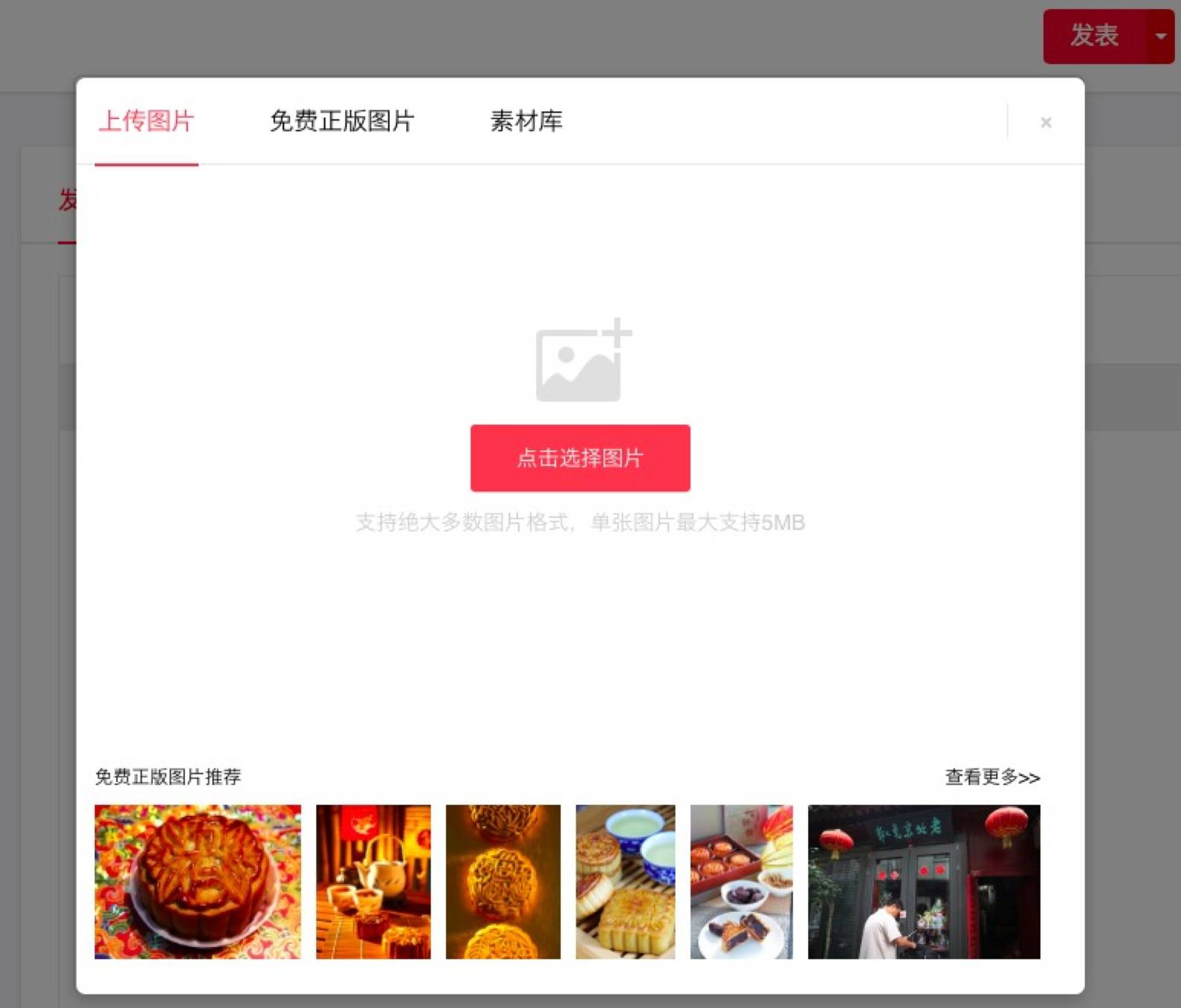 如下图所示,如果文章中提到了比较多的“月饼”,点击“插入图片”按钮后,系统会自动显示很多张与中秋、月饼相关的图片,省去了作者四处找图的辛苦!