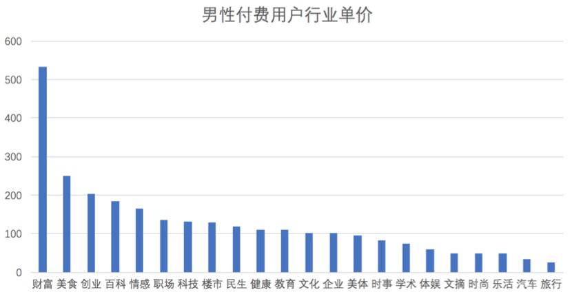 从男女付费用户行业单价对比看,女性消费能力最高的居然是“美食”“财富”“百科”类,男性消费力最高的则是“财富”“美食”“创业”。