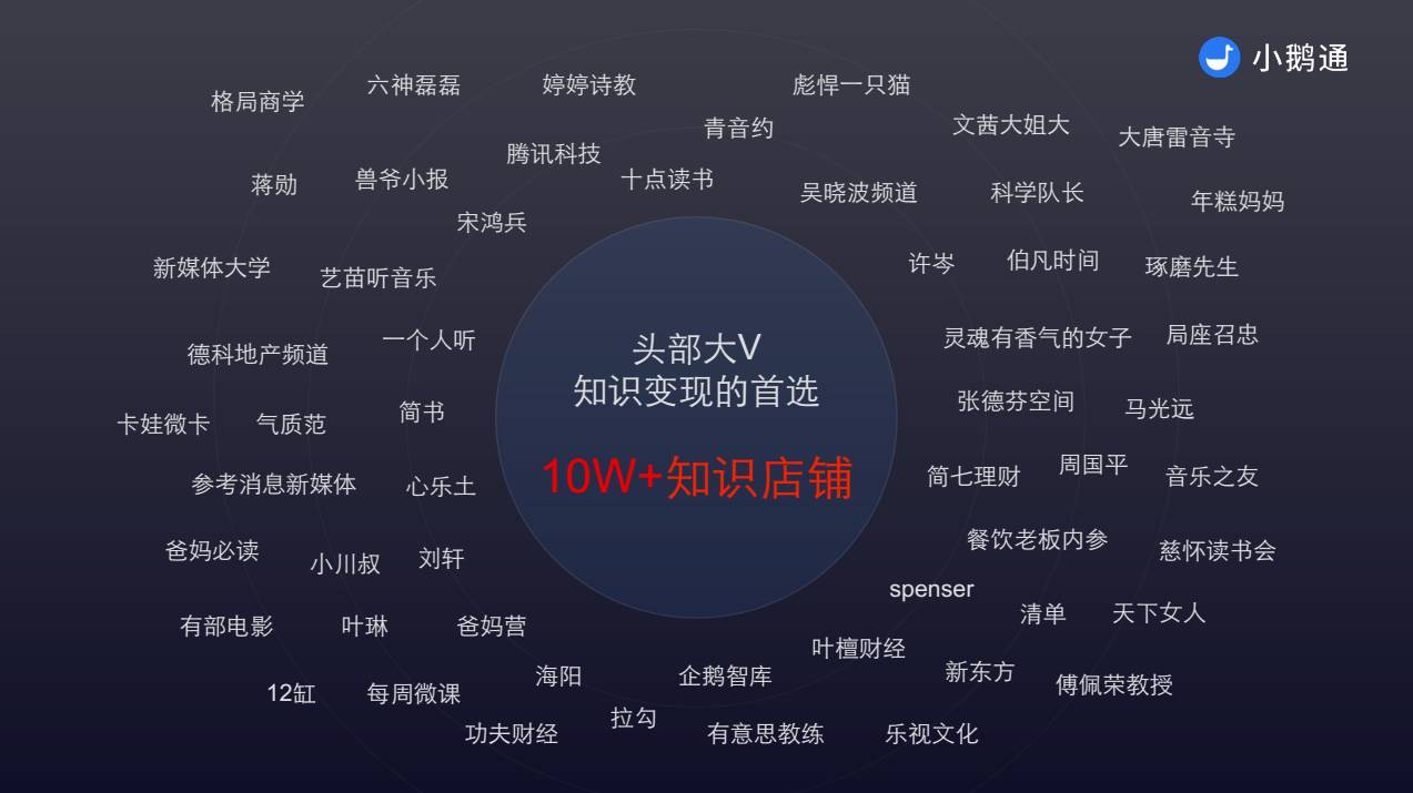 他举例,在小鹅通上目前流水最漂亮的是“十点读书”的十点课堂,单月营收能到900万元。其它千万级营收还有吴晓波频道、功夫财经、张德芬空间、小小包麻麻等。