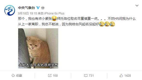 或许网友们画风太歪,@中央气象台 小编忍不住跳出来说“拜托各位取名尽量慎重一点,不然HR问我为什么从上一家离职,我总不能说,因为给台风起名没起好吧”。