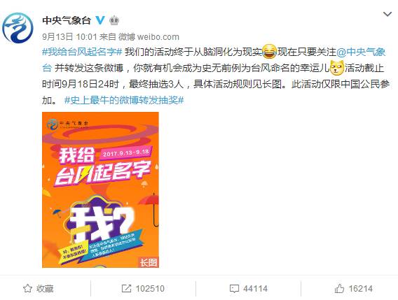 是不是很脑洞大开很会玩?9月13日,@中央气象台在微博上发起#我给台风起名字#活动,关注账号且转发微博,即有可能成为史无前例的台风命名者。活动仅限中国公民参加。
