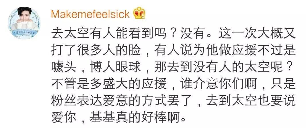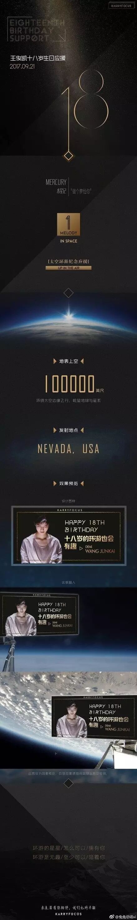 小螃蟹(王俊凯的粉丝昵称)们说:“这一次选择让祝福飞到10万英尺的太空边缘,目光所及星辰满目,爱和希望围着梦想环绕。十八岁的你,内心依然做着孩童时星辰大海的梦,所以送你到更辽阔的未知之地。”