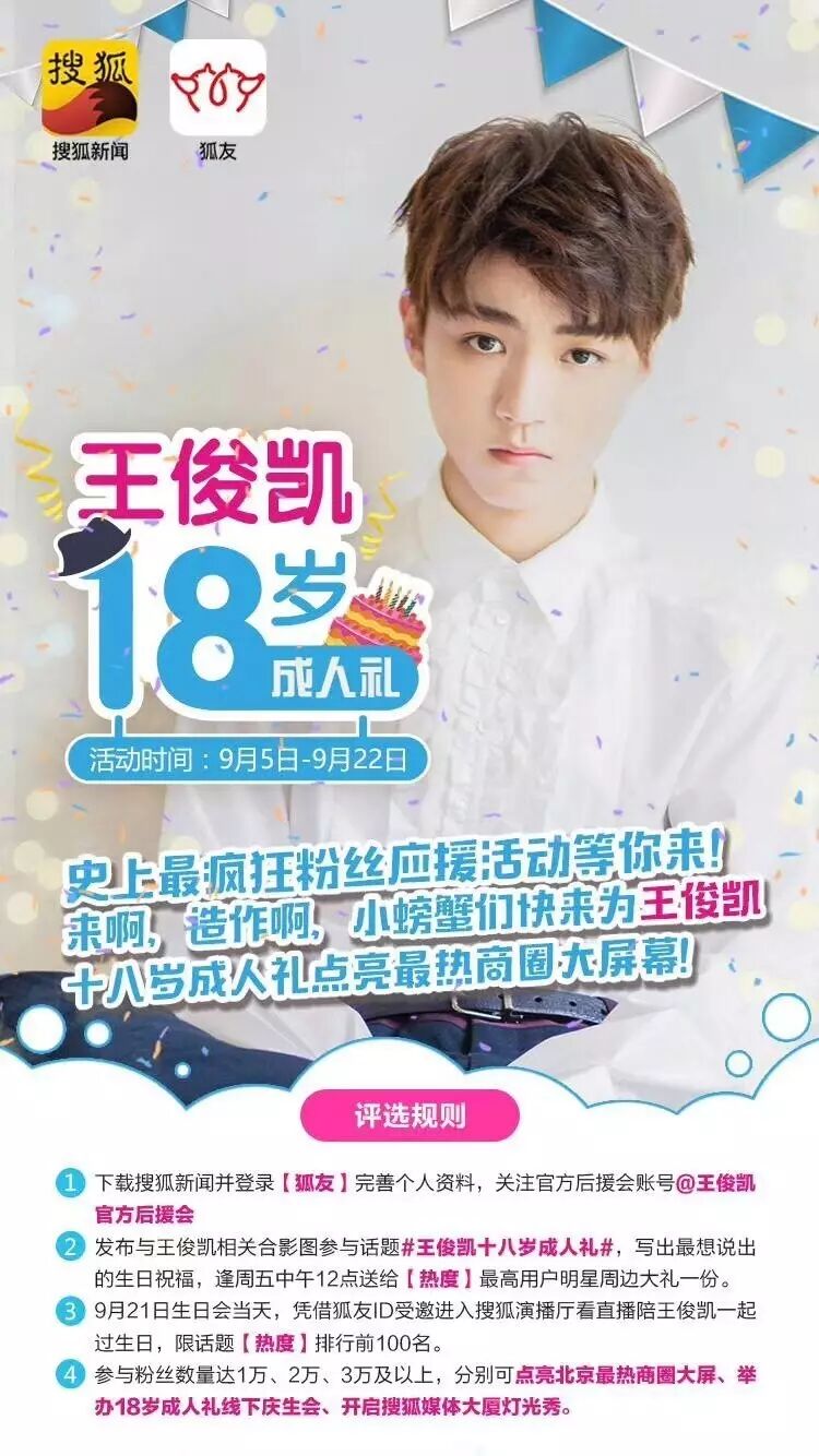 如“王俊凯的蟹工坊”为他投放了爱奇艺15秒贴片广告、上线企鹅FM的开屏广告;“王俊凯微吧”为他拉动了百位媒体及艺人工作室共同应援;“王俊凯姐姐站”为他联合花椒相机定制了专属脸萌……