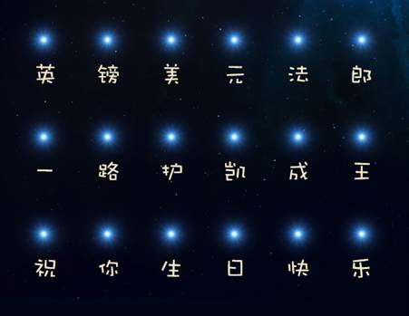 这18颗星星象征王俊凯的18岁青春,每颗星都代表一个字,连起来是:“英镑美元法郎,一路护凯成王,祝你生日快乐。”