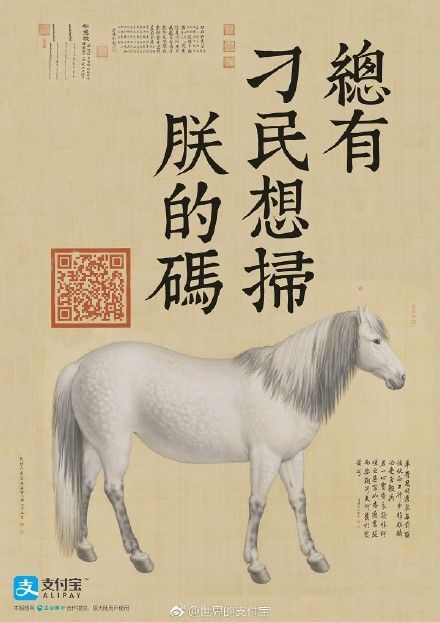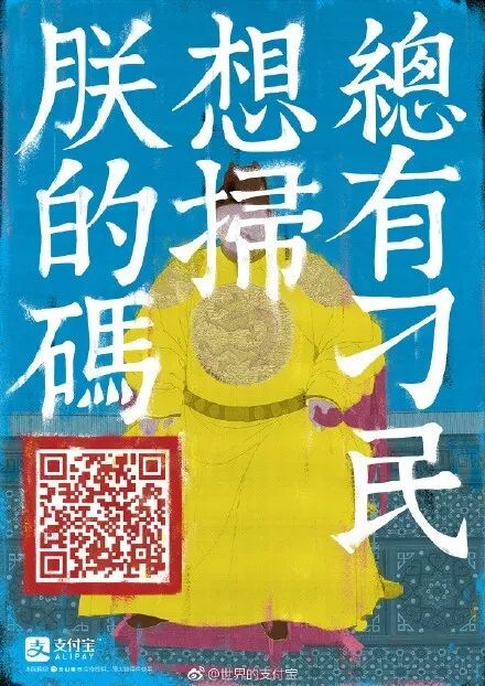最近,支付宝在台湾推出的系列收钱码迅速吸引了一波关注:“总有刁民想扫朕的码”“奉旨收钱”加上有设计感的刻版字体、皇上、工笔画和印章式的二维码,看上去十分宫廷风。而它出现的场景也十分应景,从桃园机场到101大厦,甚至还有台北故宫的文创商店。