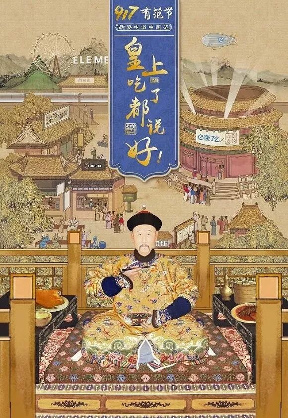 而除了故宫文创之外,这种元素也开始被很多品牌运用。最近饿了么也在和故宫的食品天猫店“朕的心意”合作策划了一次有关吃货的营销。
