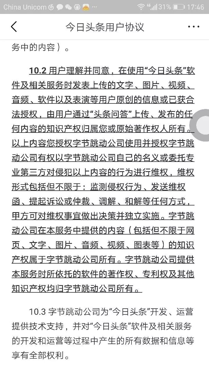 首先,今日头条对于内容的版权还是不错的,包括今日头条上的内容,以及悟空问答的内容,版权都是属于用户个人的,并且针对侵权提供了维权的服务。