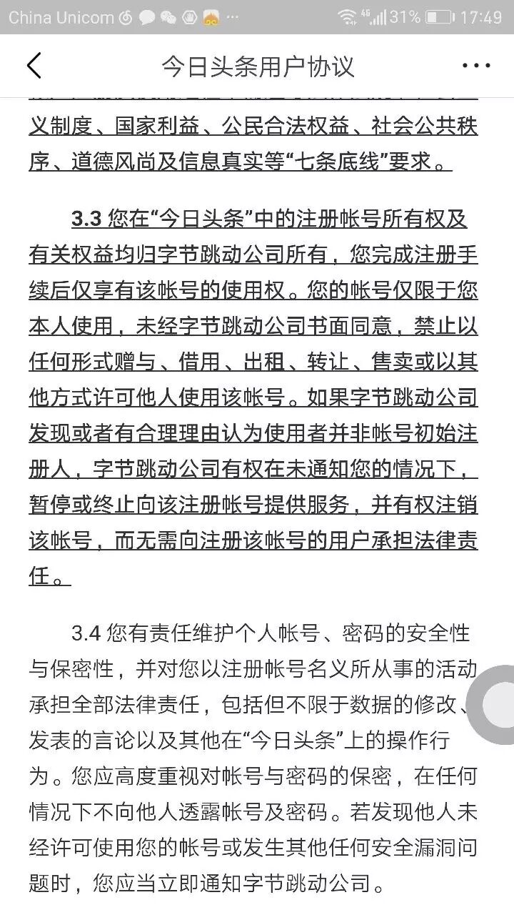 而且,平心而论,微博版权相对来说比较好操作,比起之前今日头条因为版权的事情和媒体打官司,让用户授权同步内容要简单的多,不过我们在翻看今日头条的用户协议时也发现了一个比较重要的地方。