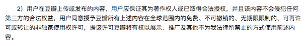 豆瓣也代表了绝大多数平台的做法, 版权归你,但我有使用权,如果涉及到商业收益,那么分成怎么分,咱们具体谈。但用户在豆瓣上发表的内容,还是有基本保障的。