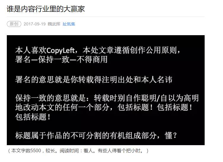 还有一点,可以在文章的开头或结尾,严厉声明文章版权不容侵犯,表明自己对转载的要求。让我们来欣赏一下“扯氮集”的魏武挥老师平时惯用的“大黑图”: