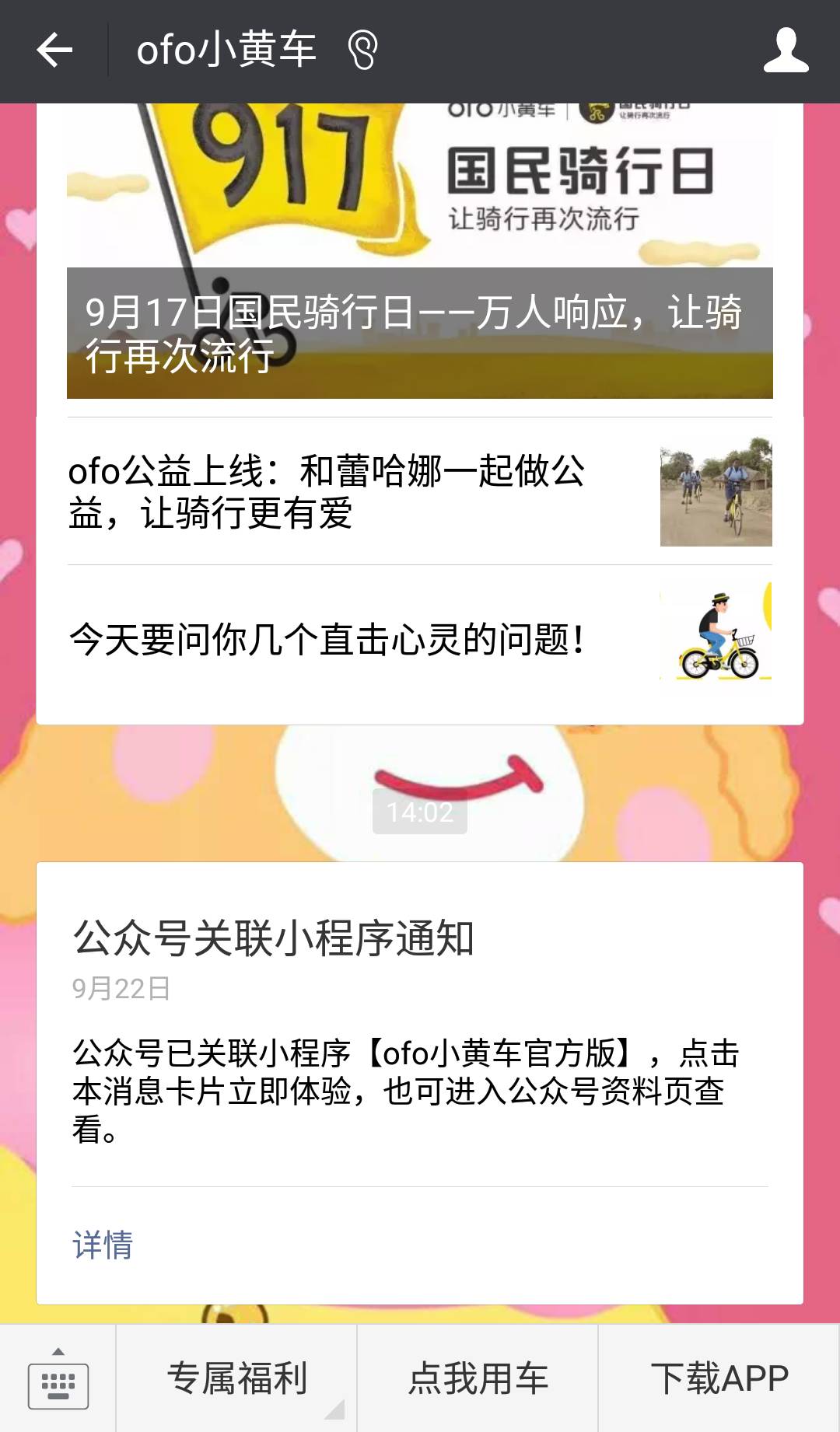 新榜综合 9月22日下午,ofo微信官方公众号“ofo小黄车”关联了微信小程序“ofo小黄车官方版”。目前,小程序“ofo小黄车官方版”关联了12个公众号,都是ofo在各个城市的地方号。