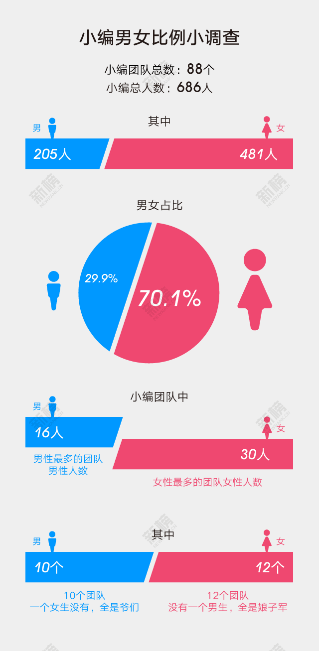 巧的是,无论是来“小小包麻麻”投简历的男女比例,还是新榜内容团队的男女比例,都和我们今天的调查结果基本吻合。