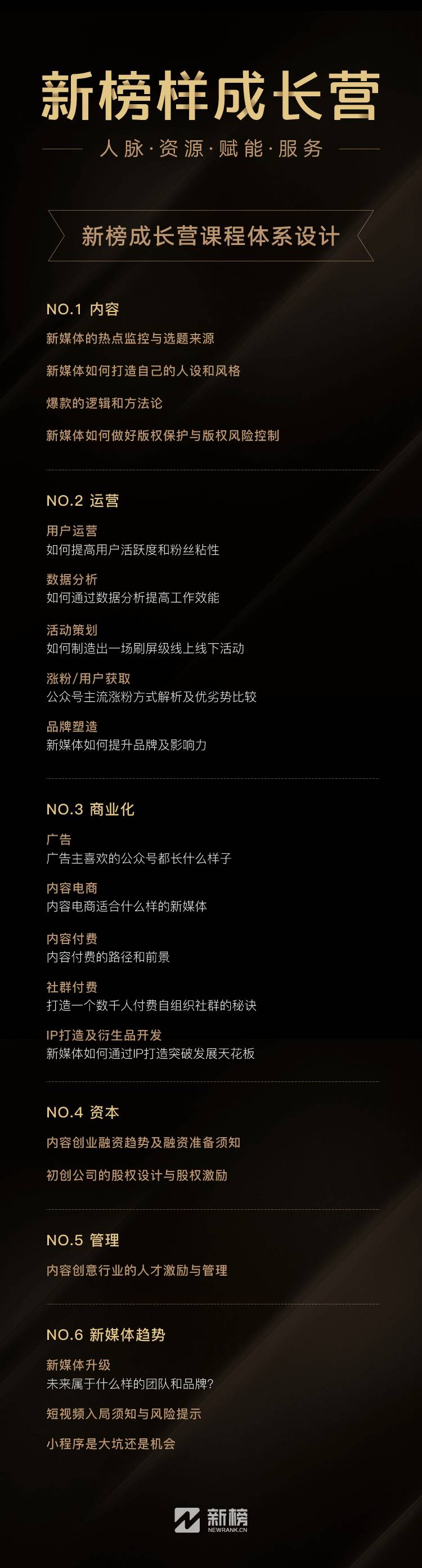 课程体系方面,涵盖内容、运营、商业化、资本管理和新媒体趋势六大模块,涵盖一个优秀的新媒体合伙人或者创始人所需要的主干知识体系。