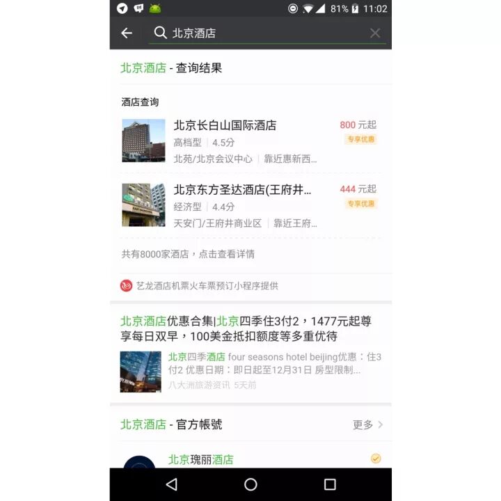 在搜索栏输入地点+酒店预订,搜索结果会直接展示相应城市的酒店信息。点击可直接进入艺龙小程序,预订相应酒店。