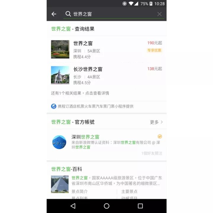 在搜索栏输入景点名称,搜索结果会直接展示门票价格,点击即可直接进入携程的小程序购买。